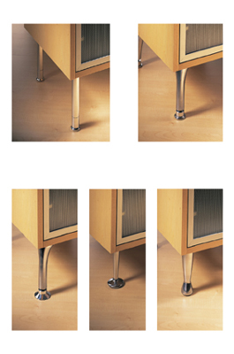 In jüngster Vergangenheit hat sich Häfele dem Thema Beinfreiheit am Möbel intensiv gewidmet und eine ansehnliche Kollektion von unterschiedlichsten Unterbausystemen in sein Programm aufgenommen. Vom höhenverstellbaren Designer-Möbelfuß im Materialmix Holz-Metall über Tischbeine und Kunststoffrollen bis zum rationell und kostengünstig einsetzbaren Standardfuß reicht heute das Angebot, das sich äußerst erfolgreich am Markt platziert hat. Mit dem kombinierbaren Möbelfußsystem erweitert Häfele nun erneut die Palette seiner Angebote in diesem Segment. | Häfele macht’s möglich: Aus wenigen Teilen entstehen die unterschiedlichsten Möbelfüße. Sie werden mit Gewindeschraube oder mit Anschraubplatte am Möbel befestigt. |
